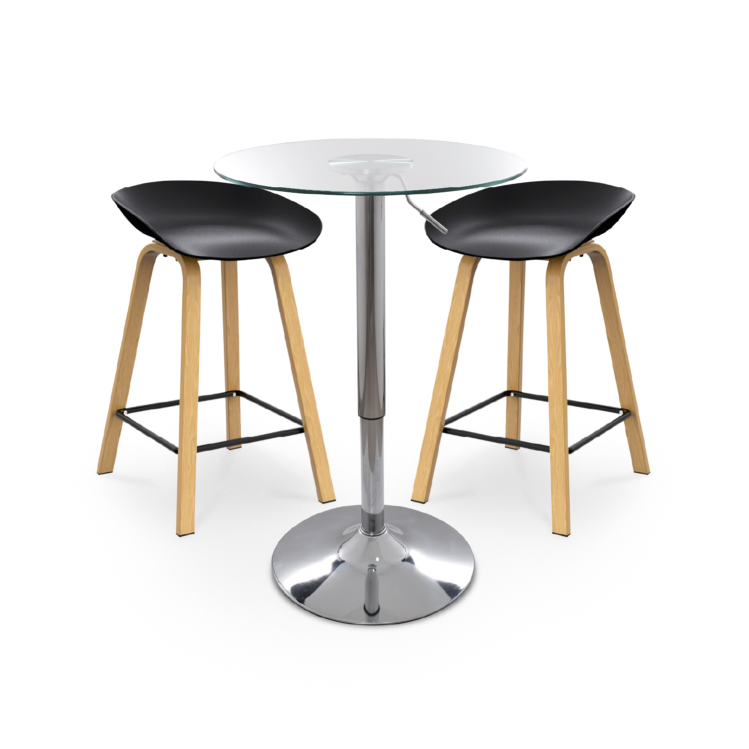 El Set Manhattan incluye dos sillas tipo bar con asientos en polipropileno, resistentes y fáciles de limpiar, junto a una mesa alta con superficie de vidrio templado que aporta elegancia y seguridad. Su estructura metálica termolaminada con acabado tipo madera combina durabilidad y estética. Además, la mesa cuenta con altura regulable para adaptarse a distintas necesidades. Un conjunto compacto y contemporáneo, ideal para optimizar espacios reducidos sin renunciar al diseño.
